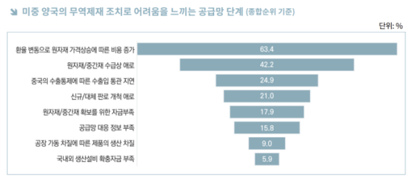 무역협회가 지난해 기준 수출 실적 50만 달러 이상 제조기업 740곳을 대상으로 실시한 설문조사에 따르면 응답 기업의 53.4%는 전년 대비 공급망 조달 여건이 악화될 것으로 예상했다. 미국과 중국의 무역 제재에 따른 어려움으로는 ‘환율 변동으로 인한 원자재 가격 상승(63.4%·복수응답)’, ‘원자재·중간재 수급(42.4%)’, ‘중국 수출통제에 따른 통관 지연(24.9%)’ 등이 꼽혔다.