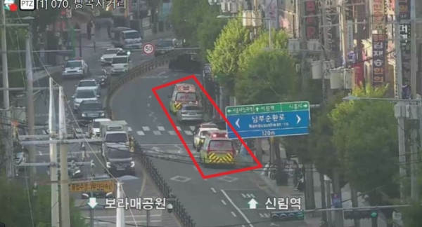 서울시 교통정보에 따르면 당곡사거리에서 신림역으로 향하는 신림로가 화재 관련으로 부분 통제되고 있다.