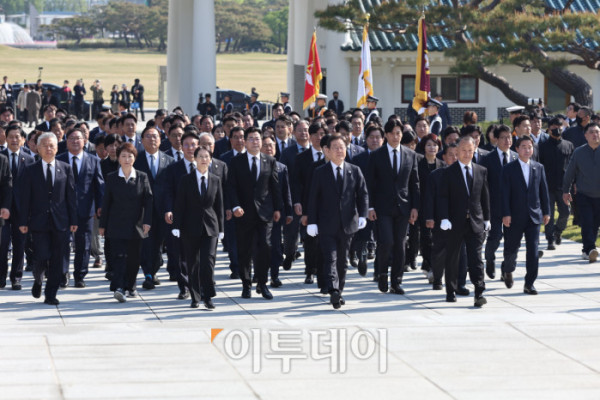 ▲이재명 더불어민주당 대선후보가 28일 서울 동작구 국립서울현충원에서 당 지도부와 함께 참배를 마친 후 대통령 묘소로 이동하고 있다. 조현호 기자 hyunho@