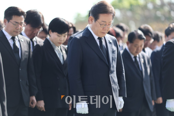 이재명 더불어민주당 대선후보가 28일 서울 동작구 국립서울현충원에서 당 지도부와 함께 참배하고 있다. 조현호 기자 hyunho@