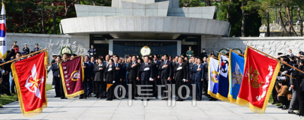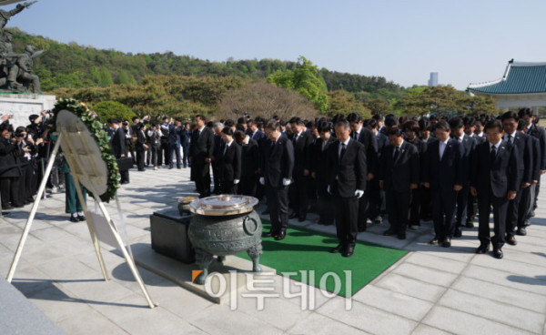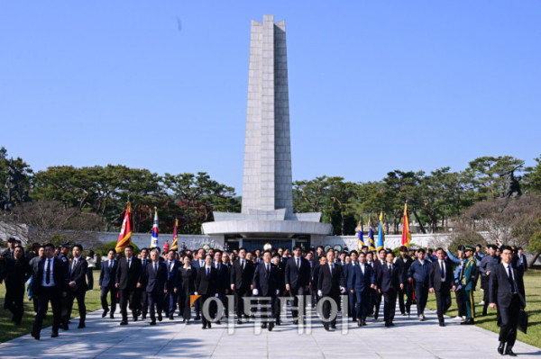 ▲이재명 더불어민주당 대선후보가 28일 서울 동작구 국립서울현충원에서 당 지도부와 함께 참배하고 있다. 조현호 기자 hyunho@