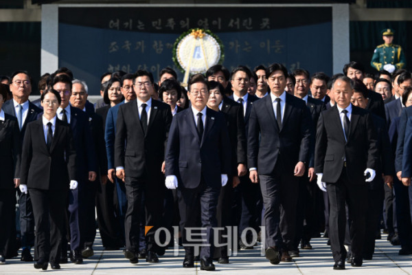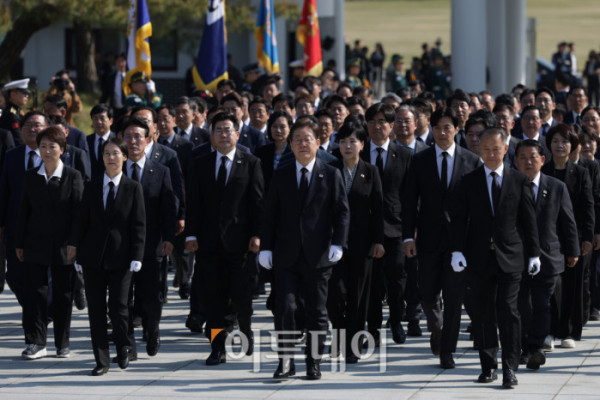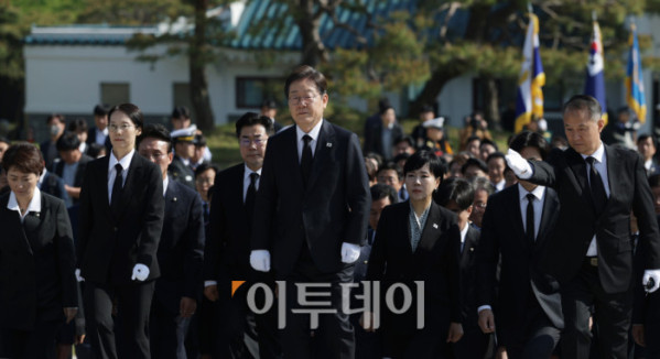 ▲이재명 더불어민주당 대선후보가 28일 서울 동작구 국립서울현충원에서 당 지도부와 함께 참배를 위해 이동하고 있다. 조현호 기자 hyunho@