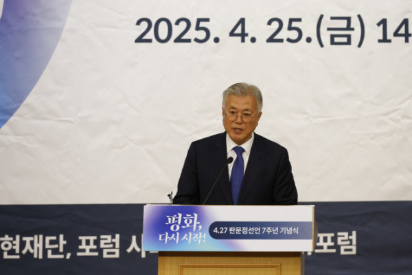 ▲문재인 전 대통령이 25일 서울 여의도 국회도서관에서 열린 4.27 판문점선언 7주년 기념식에 참석해 기념사를 하고 있다. 2025.4.25. (연합뉴스)