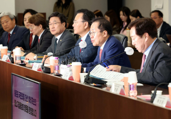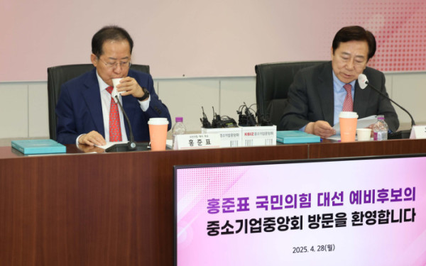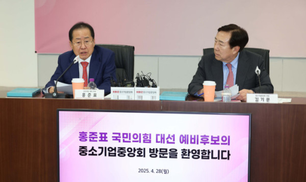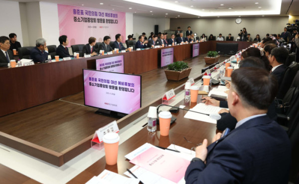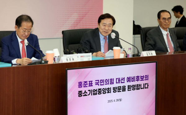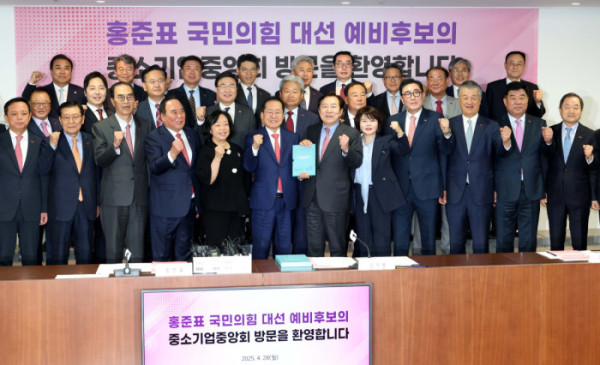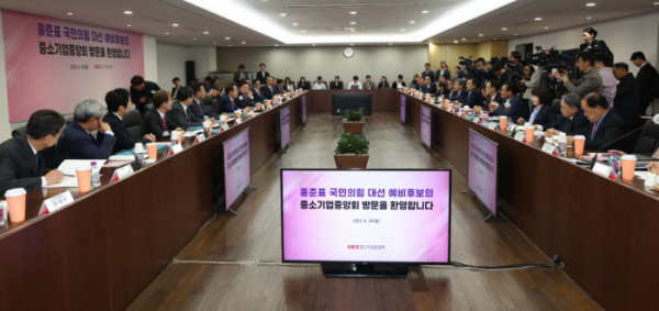 홍준표 국민의힘 대선 예비후보가 28일 서울 여의도 중기중앙회에서 김기문 중소기업중앙회장 등 중소기업인들과의 간담회를 가졌다.