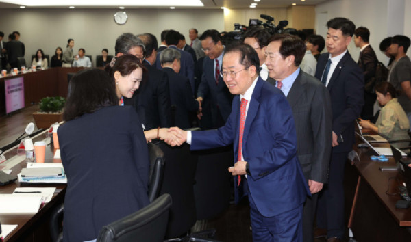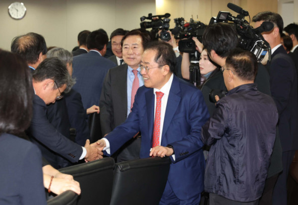▲홍준표 국민의힘 대선 예비후보가 28일 서울 여의도 중기중앙회에서 열린 중소기업인들과의 간담회에 참석하며 기업인들과 인사하고 있다. 신태현 기자 holjjak@