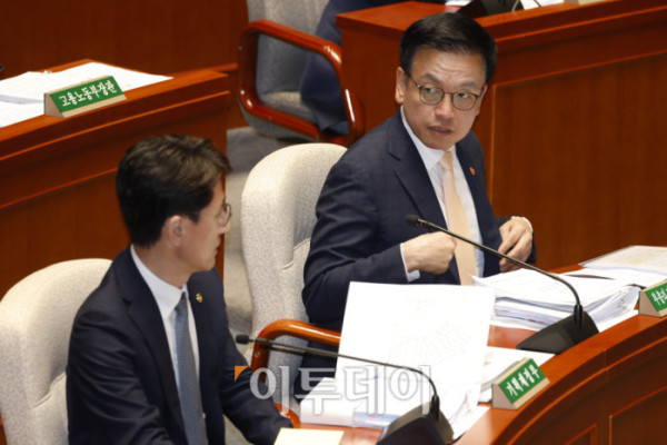 ▲최상목(오른쪽) 경제부총리 겸 기획재정부 장관과 김윤상 2차관이 28일 서울 여의도 국회에서 열린 예산결산특별위원회 전체회의에서 대화하고 있다. 고이란 기자 photoeran@