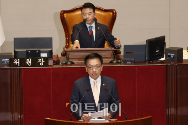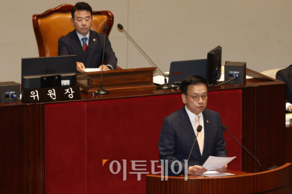 ▲최상목 경제부총리 겸 기획재정부 장관이 28일 서울 여의도 국회에서 열린 예산결산특별위원회 전체회의에서 2025년도 제1회 추가경정예산안 제안설명을 하고 있다. 고이란 기자 photoeran@