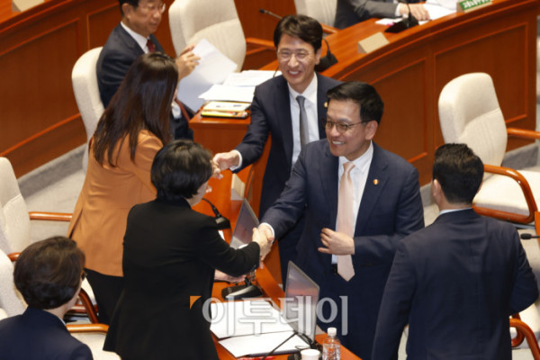 ▲최상목 경제부총리 겸 기획재정부 장관이 28일 서울 여의도 국회에서 열린 예산결산특별위원회 전체회의에서 의원들과 인사하고 있다. 고이란 기자 photoeran@