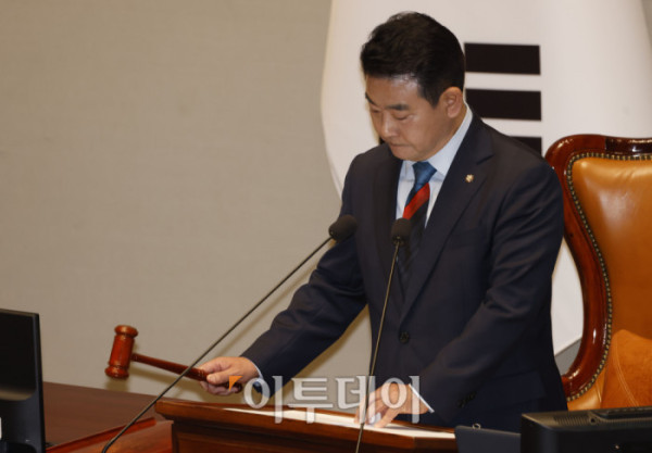 ▲28일 서울 여의도 국회에서 열린 예산결산특별위원회 전체회의에서 박정 위원장이 의사봉을 두드리고 있다. 고이란 기자 photoeran@