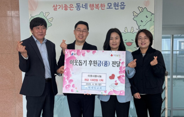 모현읍은 모현제일교회가 25일 행정복지센터를 방문해 복지사각지대 이웃을 위한 성금 139만 원을 기탁했다고 밝혔다. 이 교회 교인들이 부활절을 맞아 지역 내 어려운 가정을 위한 실질적 도움을 위해 20일간 자발적으로 모금했다.