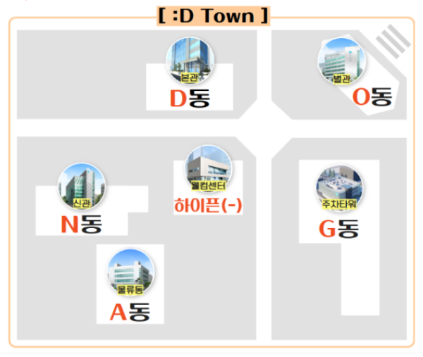 확정된 6개 건물명은 DONG-A의 이니셜을 따왔다. 본관은 D동으로 90년 넘는 역사를 이어가는 동아를 상징한다. 별관은 O동으로 동아오츠카가 있는 건물이자, 동아의 발전과 성장을 전망하는 ‘Outlook’를 상징한다. 신관은 N동은 신약(New) 개발로 동아쏘시오그룹의 미래를 항해하는 ‘Navigator’를 상징한다. 주차타워인 G동은 많은 임직원이 오가는 주차타워의 기능을 담아 ‘Garage’를 상징한다. 웰컴센터인 ‘하이픈(-)’은 외부와 동아를 연결하는 다리를 상징하며 물류동인 A동은 바쁘게 움직이는 건물인 만큼 활동적인 의미의 ‘Activation’를 상징한다.