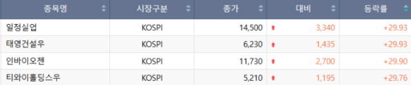 25일 코스피 시장에서 상한가를 기록한 종목은 일정실업, 태영건설우, 인바이오젠, 티와이홀딩스우 등 4종목이었다. 하한가를 기록한 종목은 없었다.
