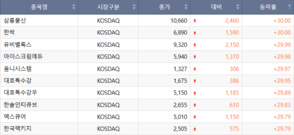 코스닥 시장에서 상한가를 기록한 종목은 삼륭물산, 한싹, 유비벨록스, 아이스크림에듀, 옴니시스템, 대호특수강, 대호특수강우, 한솔인티큐브, 엑스큐어, 한국팩키지 등 10종목이다.