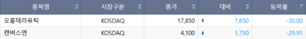 코스닥 시장에서 하한가를 기록한 종목은 오름테라퓨틱, 캔버스엔 등 2종목이다.