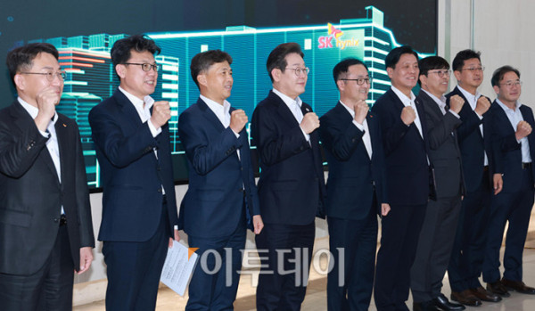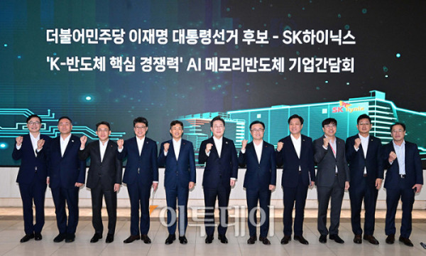 ▲이재명(앞줄 오른쪽) 더불어민주당 대선 후보와 곽노정 SK하이닉스 대표이사 사장이 28일 경기 이천 SK하이닉스에서 열린 K-반도체 AI메모리반도체 기업 간담회에 참석하며 대화하고 있다. 국회사진취재단