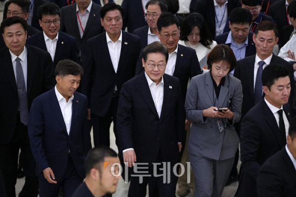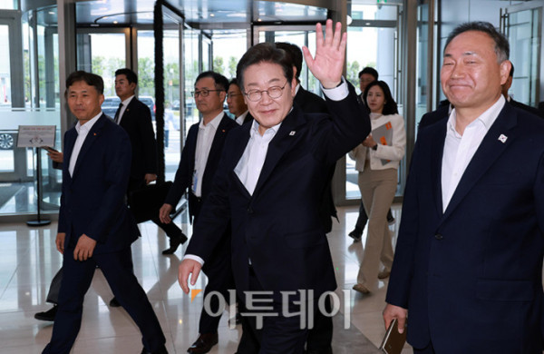 ▲이재명 더불어민주당 대선 후보가 28일 경기 이천 SK하이닉스에서 열린 K-반도체 AI메모리반도체 기업 간담회에 참석하고 있다. 왼쪽은 곽노정 CEO. 국회사진취재단