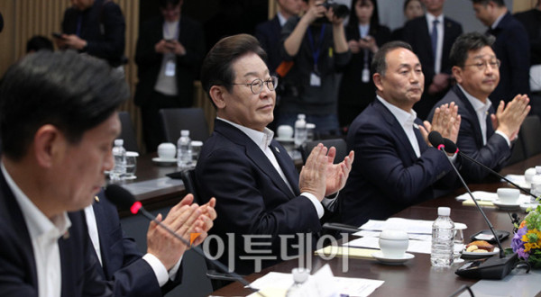 ▲이재명 더불어민주당 대선 후보가 28일 경기 이천 SK하이닉스에서 열린 K-반도체 AI메모리반도체 기업 간담회에서 박수치고 있다. 국회사진취재단