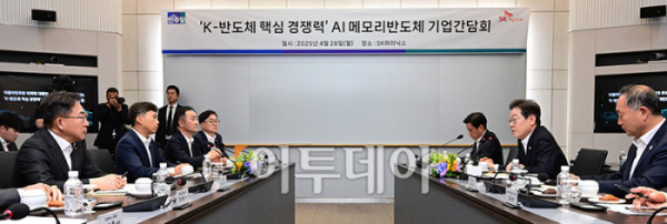 이재명 더불어민주당 대선 후보와 곽노정 SK하이닉스 대표이사 사장이 28일 경기 이천 SK하이닉스에서 열린 K-반도체 AI메모리반도체 기업 간담회에 참석하며 대화하고 있다. 국회사진취재단