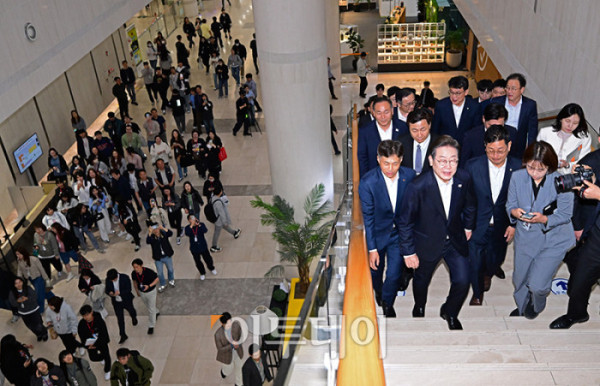 ▲이재명 더불어민주당 대선 후보가 28일 경기 이천 SK하이닉스 이천캠퍼스에서 열린 K-반도체 AI메모리반도체 기업 간담회에 참석하고 있다. 왼쪽은 이재명 후보를 보기 위해 모인 SK하이닉스 직원들의 모습. 국회사진취재단
