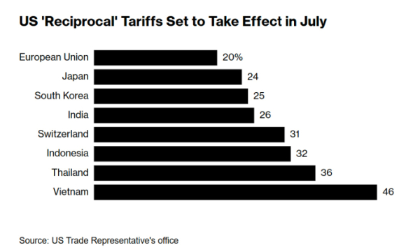 블룸버그통신은 27일(현지시간) 수출에 의존하는 아시아 국가들이 미국의 높은 관세율에도 유럽 등 서방 국가들보다 트럼프 정권과의 무역 협상에서 진전을 보고 있다고 보도했다. 이어 한국, 일본, 인도 등 아시아 국가들은 상호관세 유예 기한인 7월 8일 이전에 소규모 잠정 합의에 이를 가능성이 크다고 내다봤다. 트럼프 대통령은 협상 타결을 자신의 파괴적인 무역정책의 빠른 성과를 선전할 것으로 예상된다.