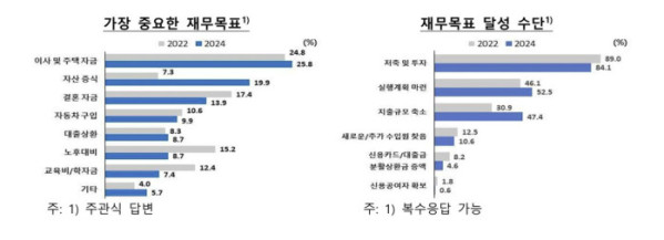29일 한국은행과 금융감독원에 따르면 ‘2024 전국민 금융이해력 조사’ 결과 장기 재무목표가 있는 성인의 경우 가장 중요한 재무목표로 주택구입(25.8%), 자산증식(19.9%), 결혼자금(13.9%) 순으로 답했다. 2년 전과 비교했을 때 자산증식 응답률이 12.6%포인트(p) 상승하며 결혼자금을 제쳤다. 주택구입 응답률이 1.0%p 상승하고, 결혼자금 응답률이 3.5%p 하락한 것과 비교하면 큰 폭으로 올랐다.