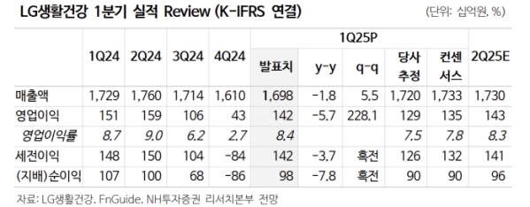 LG생활건강의 1분기 매출액은 전년 대비 2% 감소한 1조6980억 원, 영업이익은 6% 감소한 1424억 원으로 컨센서스를 웃돌았다. 그는 "화장품 부문에서 중국 수익성 개선이 주효했다"며 "방판 등 전통 채널 축소 지속되나 국내 온라인, H&B 채널과 힌스는 일본 중심으로 고성장을 시현했다"고 평가했다.
