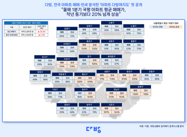 29일 부동산 정보 플랫폼 ‘다방’에 따르면 서울 지역 아파트 국민평형 평균 매맷값은 14억5981만 원, 평균 전세 보증금은 6억5292만 원으로 나타났다. 이는 지난해 동기 대비 각각 25.5%, 2.3% 증가한 수치다.
