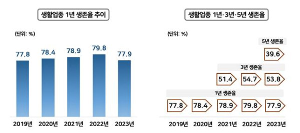 발표에 따르면, 100대 생활업종의 1년 생존율은 2022년까지 상승하다가 2023년에 소폭 하락했다. 2023년 기준 1년 생존율은 78.0%, 3년 생존율은 53.8%, 5년 생존율은 39.6%로 집계됐다.