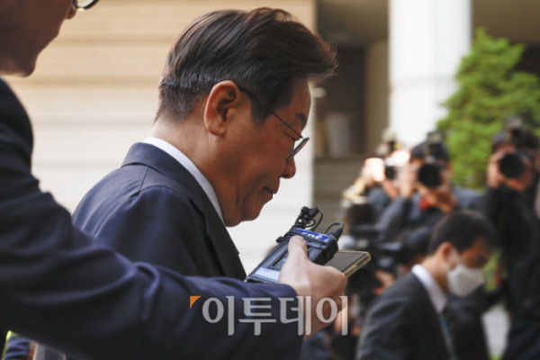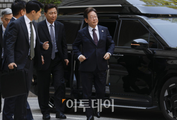 ▲이재명 더불어민주당 대선후보가 29일 서울 서초구 서울중앙지방법원에서 열린 대장동 배임·성남FC 뇌물 1심 속행 공판에 출석하고 있다. 조현호 기자 hyunho@