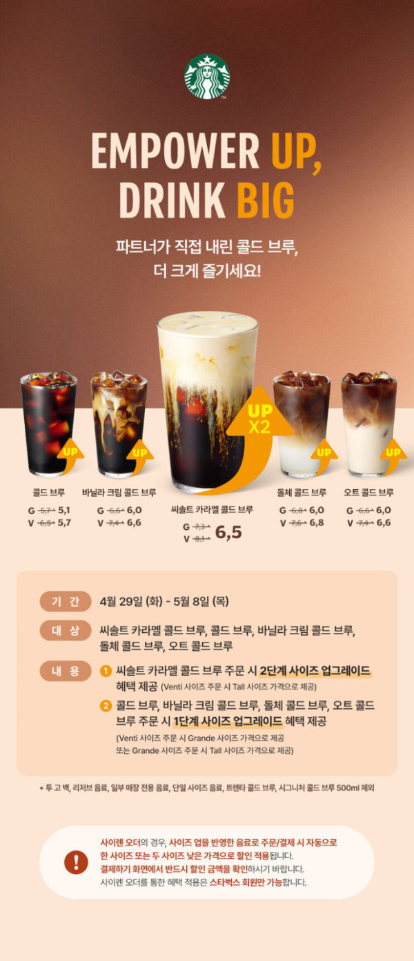 스타벅스가 5월 연휴를 맞아 콜드 브루 음료 사이즈업 이벤트를 다음 달 8일까지 진행한다. 대상은 씨솔트 카라멜 콜드 브루, 콜드 브루, 바닐라 크림 콜드 브루, 돌체 콜드 브루, 오트 콜드 브루 등 5종이다. 이 중 프로모션 음료인 씨솔트 카라멜 콜드 브루는 두단계, 나머지 4종은 한단계씩 사이즈업 혜택을 받을 수 있다. 최대 1600원 할인 혜택이다.