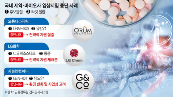 6일 제약·바이오업계에 따르면 최근 오름테라퓨틱스, LG화학, 지놈앤컴퍼니 등이 개발 중이던 신약 후보물질의 임상을 중단했다.