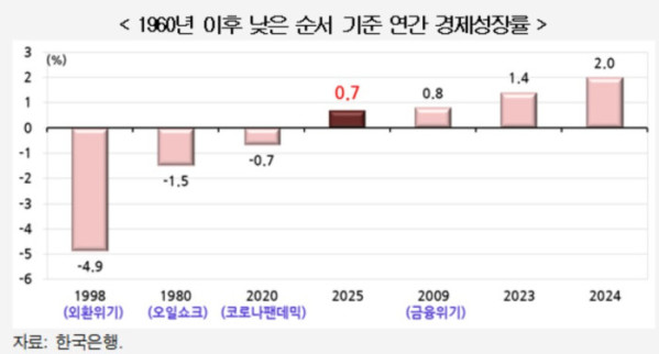 연구원은 1일 수정경제저망을 통해 올해 우리나라 경제성장률 전망치를 기존(1.7%)보다 1%포인트(p)나 낮춘 0.7%로 하향 조정했다.