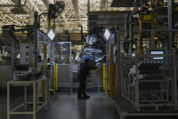 ▲중국 동부 저장성 닝보 중국 자동차 조립 공장에서 한 작업자가 차량 부품을 설치하고 있다. AP연합뉴스
