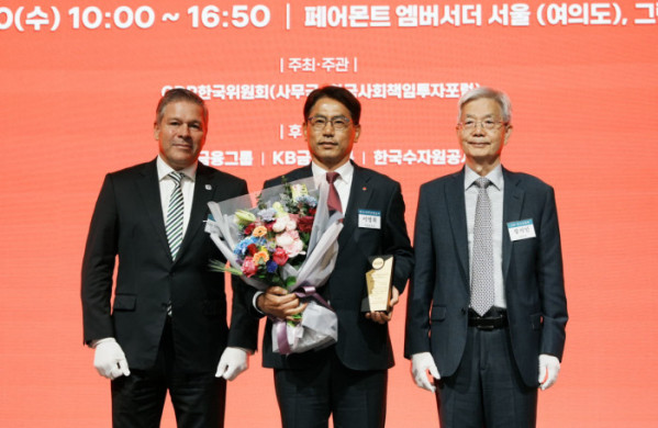 ▲이병휘 한국지역난방공사 사업본부장(가운데)가 30일 서울 여의도 페어몬트 앰배서더 호텔에서 열린 ‘2024년 CDP 기후변화 대응 및 물 경영 우수기업 시상식’에서 ‘기후변화 대응 우수기업’을 수상한 후 CDP 호세 오도네즈 CRO(왼쪽) 및 CDP 한국위원회 장지인 위원장과 기념 촬영을 하고 있다. (사진제공=한국지역난방공사)