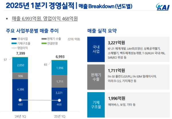 한국항공우주(KAI)가 1분기 연결기준 영업이익 468억 원으로 전년(480억 원) 대비 2.5% 감소했다고 잠정 공시했다.
