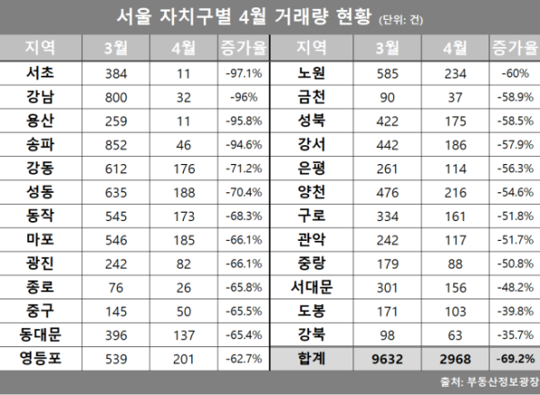 2일 서울부동산정보광장에 따르면 지난 4월 한 달간 서울 아파트 거래량은 2968건으로 전월(3월 9632건) 대비 68.4% 줄었다. 월간 기준으로는 지난해 2월(2715건) 이후 14개월 만에 최저 수준이다.