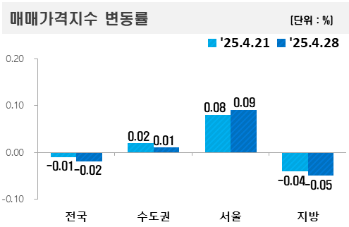 1일 한국부동산원이 발표한 주간 아파트값 동향에 따르면 4월 넷째 주(4월 28일 기준) 서울 아파트값은 지난주보다 0.01%포인트(p) 오른 0.09%로 집계됐다.