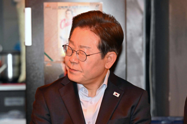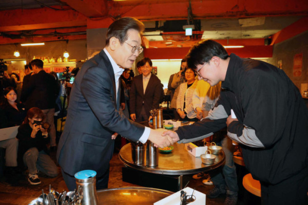 ▲이재명 더불어민주당 대선후보가 1일 서울 종로구 종각젊음의거리의 한 음식점에서 ‘민생시리즈2’ 비전형 노동자 간담회를 갖고 있다. 대법원 전원합의체는 이날 이 후보에게 무죄를 선고한 원심판결을 파기하고 사건을 서울고법으로 돌려보냈다. 신태현 기자 holjjak@