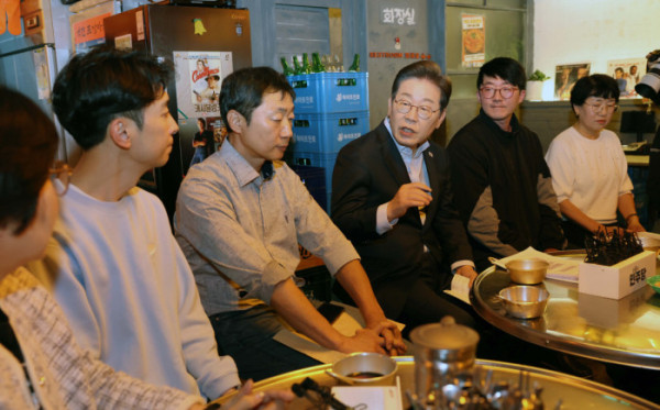 이재명 더불어민주당 대선후보가 1일 서울 종로구 종각젊음의거리의 한 음식점에서 ‘민생시리즈2’ 비전형 노동자 간담회를 갖고 있다. 대법원 전원합의체는 이날 이 후보에게 무죄를 선고한 원심판결을 파기하고 사건을 서울고법으로 돌려보냈다.