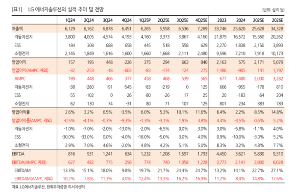 이 연구원은 “LG에너지솔루션의 1분기 부문별 영업이익은 자동차전지(–832억, AMPC 제외), 에너지저장장치(ESS)(–801억 원), 소형전지(+803억 원), AMPC(4577억 원)으로 추정한다”며 “GM향 판매가 예상보다 견조했고, 미시간 공장에서 리튬인산철(LFP) ESS 샘플이 출하되면서 AMPC 수령 규모가 시장 기대를 웃돌았다”고 분석했다.
