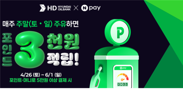 이번 프로모션은 6월 1일까지 매주 토, 일요일에 HD현대오일뱅크 주유소를 방문하는 Npay 회원을 대상으로 진행한다. 주유소에서 Npay 포인트 또는 머니로 5만원 이상 결제하는 고객은 Npay 포인트 3000원 적립 혜택을 받을 수 있다.