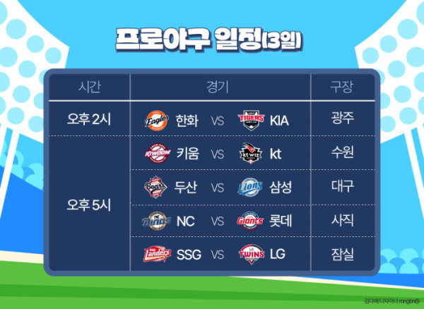 △5월 3일 프로야구 경기 일정- 한화 vs KIA (광주·14시)- 키움 vs kt (수원·17시)- 두산 vs 삼성 (대구·17시)- NC vs 롯데 (사직·17시)- SSG vs LG (잠실·17시)