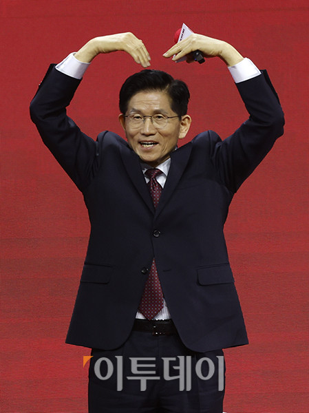 ▲3일 경기 일산 킨텍스 제1전시장에서 열린 국민의힘 대선 후보 선출을 위한 제5차 전당대회에서 김문수 후보가 머리 위로 하트를 만들고 있다. 고이란 기자 photoeran@