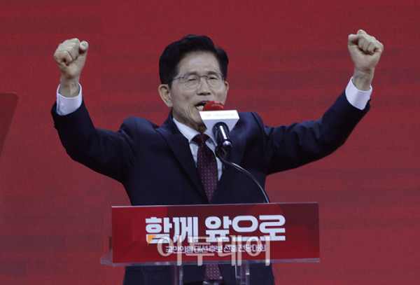 ▲3일 경기 일산 킨텍스 제1전시장에서 열린 국민의힘 대선 후보 선출을 위한 제5차 전당대회에서 대선 후보로 선출된 김문수 후보가 수락연설을 하고 있다. 고이란 기자 photoeran@