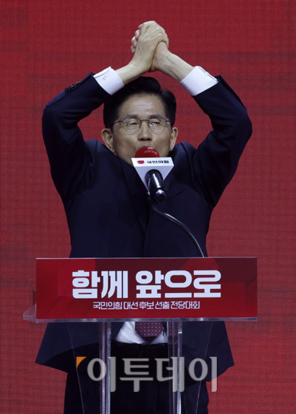 ▲3일 경기 일산 킨텍스 제1전시장에서 열린 국민의힘 대선 후보 선출을 위한 제5차 전당대회에서 대선 후보로 선출된 김문수 후보가 머리 위로 꽃다발을 들고 있다. 고이란 기자 photoeran@