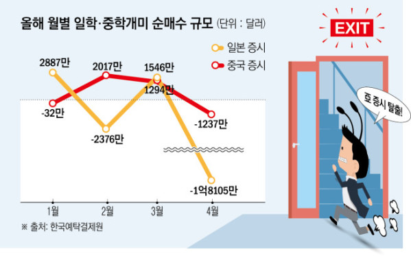 6일 한국예탁결제원에 따르면 지난달 국내 투자자들은 일본 증시와 중국 증시에서 각각 1억8105만 달러, 1237만 달러어치를 순매도했다. 연초 이후 두 증시 모두에서 매수 우위를 유지하다 4월 들어 매도 우위로 전환했다.