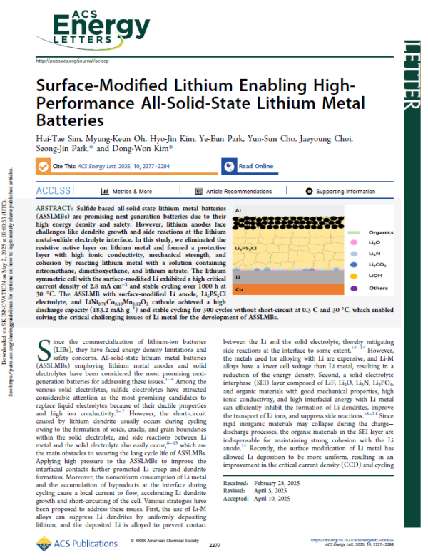 SK온은 전고체 배터리의 짧은 수명 문제를 해결하기 위해 리튬 메탈 음극을 특수 용액에 담가 무기물을 제거하고 전도성이 높은 리튬나이트라이드(Li3N)와 기계적 강도가 높은 리튬옥사이드(Li2O) 기반 보호막을 형성시켰다.
