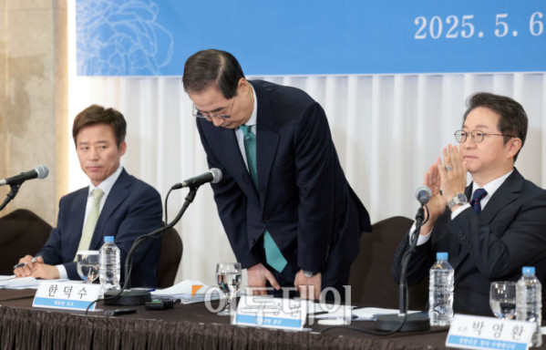 ▲한덕수 무소속 대통령선거 예비후보가 6일 서울 중구 코리아나 호텔에서 열린 관훈토론회에서 기조연설에 앞서 인사를 하고 있다. 국회사진취재단