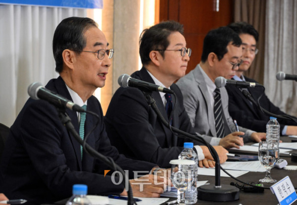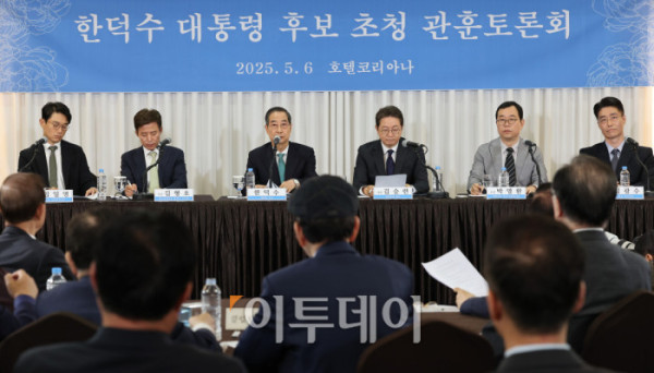 ▲한덕수 무소속 대통령선거 예비후보가 6일 서울 중구 코리아나 호텔에서 열린 관훈토론회에서 패널의 질문에 답하고 있다. 국회사진취재단