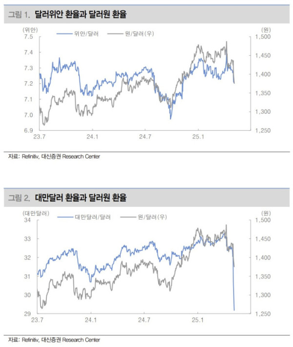 국내 연휴 중 원·달러 환율은 1360원대에 진입하며 작년 11월 이후 최저 수준으로 하락했다. 미·중 갈등 완화 기대에 아시아 통화가치 절상압력이 확대했다. 특히 대만달러 환율이 2거래일 만에 10% 급락하며 30년 중 최대 하락폭을 기록한 가운데, 원화는 헤지 수요가 더해진 것으로 보인다.